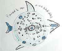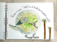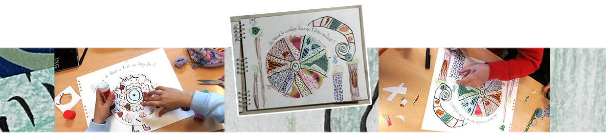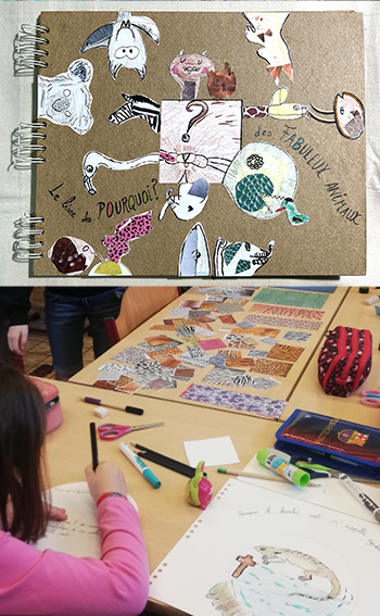 Les enfants ont ensuite réalisé une seconde illustration aux crayons aquarellables, une nouvelle fois rehaussée de contrastes au feutre noir et de textures, afin de représenter cette fois soit la réponse imaginaire soit scientifique de leur petit texte concernant leur fabuleux animal. Ces différents dessins ont ensuite été rassemblés au sein d’un cahier cartonné A3 relié par des spirales dont chaque page est consacrée à un animal. Un système de flaps permet de découvrir sous la première illustration mandala énigmatique, la seconde illustration davantage figurative ainsi que le texte des enfants créant ainsi un effet de surprise et de découverte. Les enfants ont enfin habillé le fond de leur page en illustrant autour de leur mandala les pattes et queue de l’animal avec une attention à la sobriété visant à conserver la lisibilité et l’unité entre leurs illustrations. La couverture du livre a, quant à elle, fait l’objet d’un travail de collage d’un élément « rappel » de la tête de chacun des animaux présents dans les illustrations des enfants formant comme une joyeuse ronde animale.
