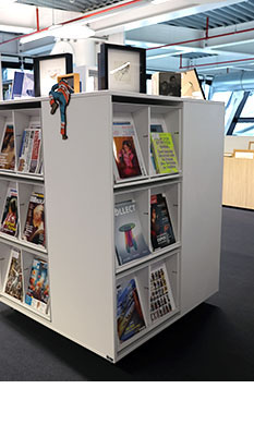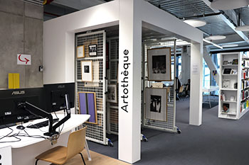 Au dernier étage, l’espace dédié à ce Pôle s’ouvre sur les rayonnages destinés aux livres d’art. Au centre, un meuble spécifique, sur lequel sont exposées des œuvres de petites dimensions, donne accès aux revues spécialisées empruntables. À gauche, un bureau de conseiller précède le mobilier caractéristique de l’Artothèque : des grilles coulissantes, sur lesquelles sont disposées harmonieusement photographies et estampes. En prolongement, un autre mobilier, constitué de casiers en bois, permet une visibilité et un accès immédiat à d’autres œuvres de toutes dimensions, révélant la richesse et la diversité de la collection. « Enfin, les derniers rayonnages sont consacrés aux livres d’artistes, objets parfois fragiles, précieux et particulièrement atypiques, invitant à la découverte et à la contemplation. »