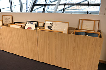 À notre connaissance, la bibliothèque du B3, s’inspirant de modèles français, est le seul établissement de lecture publique, en Belgique francophone, qui allie ces trois orientations et permet le prêt gratuit d’œuvres d’art à ses usager·es. Depuis son emménagement au B3, le Centre de ressources ³ a fait le choix de se déployer en pôles, dans un souci de visibiliser ses collections et d’épouser l’architecture particulière du nouveau bâtiment qui abrite également un FabLab et une pépinière d’entreprises. C’est au sein du Pôle Arts, accompagnée par l’artothécaire elle-même, Pascale Bastin, que nous découvrons l’Artothèque et ses collections d’œuvres d’artistes contemporain·es, principalement originaires de la Province de Liège et de la Fédération Wallonie-Bruxelles.